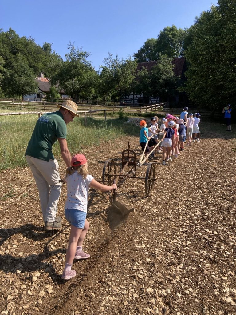 Dieses Jahr ging es mit 2 Doppelstock-Bussen zum Freilichtmuseum Neuhausen ob Eck. Neben der tollen Fahrt konnten die Kinder dort dann in verschiedenen Gruppen unterschiedliche Projekte und die Häuser kennenlernen. Von „Das Leben auf der Streuobstwiese“, „Feuer und Licht“ über „Vom Korn zum Brot“ bis hin zu „Vom Schaf zur Wolle“ war hier Einiges geboten und neben dem Gelernten war auch viel Spaß dabei. Der Förderverein unterstützte dabei nicht nur bei den sehr hohen Fahrt- und Eintrittskosten, sondern übernahm die gesamten Kosten für Würste und Brötchen. Diese wurden von den Eltern des Elternbeirats organisiert.
